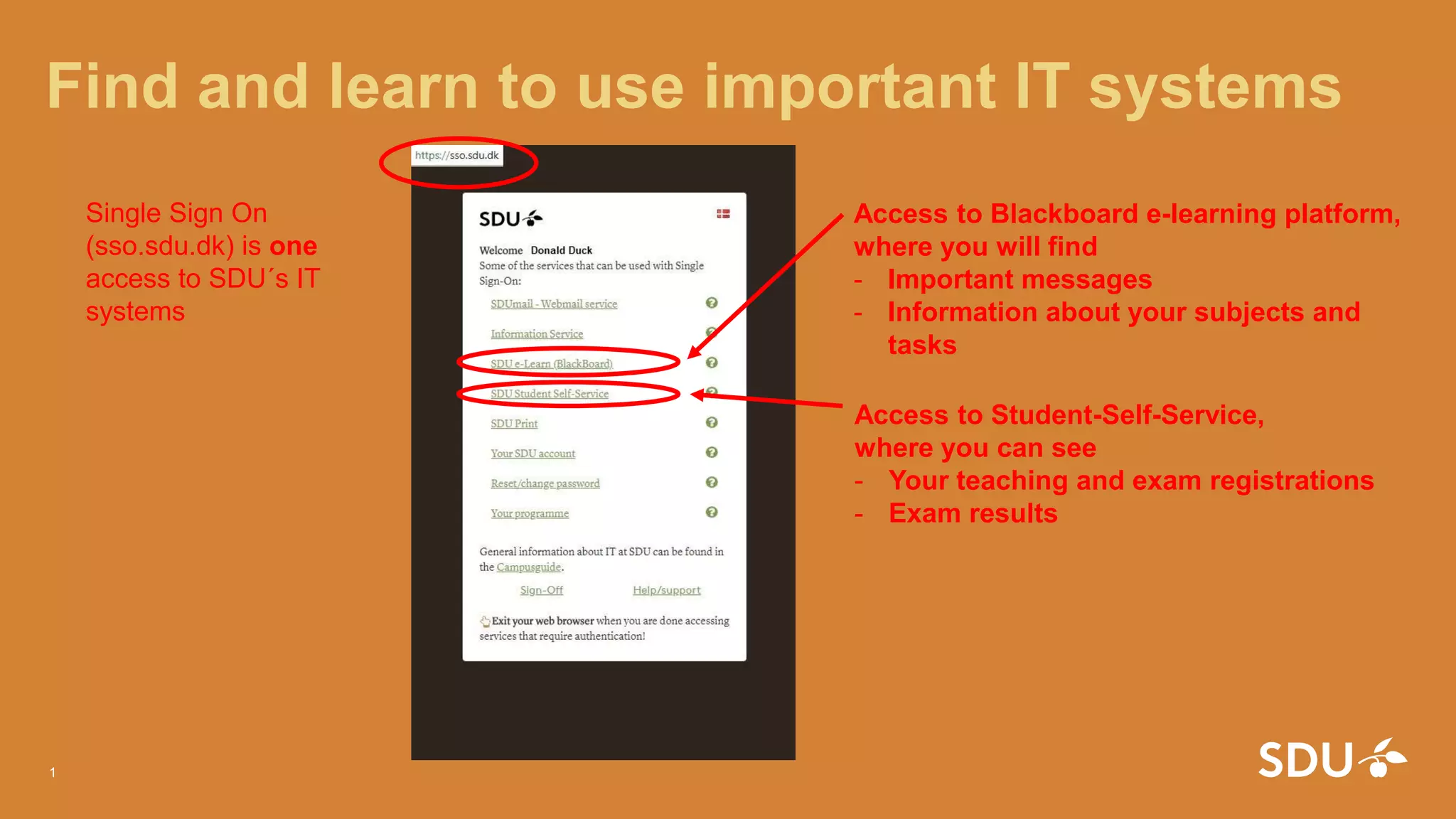 This document provides information about important IT systems for students at SDU, including Blackboard, Student-Self-Service, and MySDU. Blackboard contains messages, subject information, and tasks. Student-Self-Service allows students to see their course registrations and exam results. MySDU provides all the information students need, including guidance for new students, introductory program details, information about placement tests, and practical details. My Timetable within Blackboard and at mitsdu displays students' class schedules.