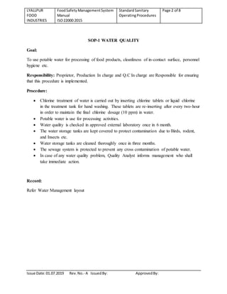 This document outlines 7 standard operating procedures (SOPs) for Lyallpur Food Industries related to food safety and sanitation. The SOPs cover topics such as water quality, personal hygiene, cleaning and disinfection, pest control, waste disposal, cross contamination prevention, and cleaning/maintenance. Each SOP describes the goal, responsibilities, and procedures to ensure food safety in areas like processing, cleaning, hygiene, and facility upkeep. Maintaining high standards of sanitation through adherence to SOPs helps Lyallpur Food Industries comply with ISO22000 food safety requirements.