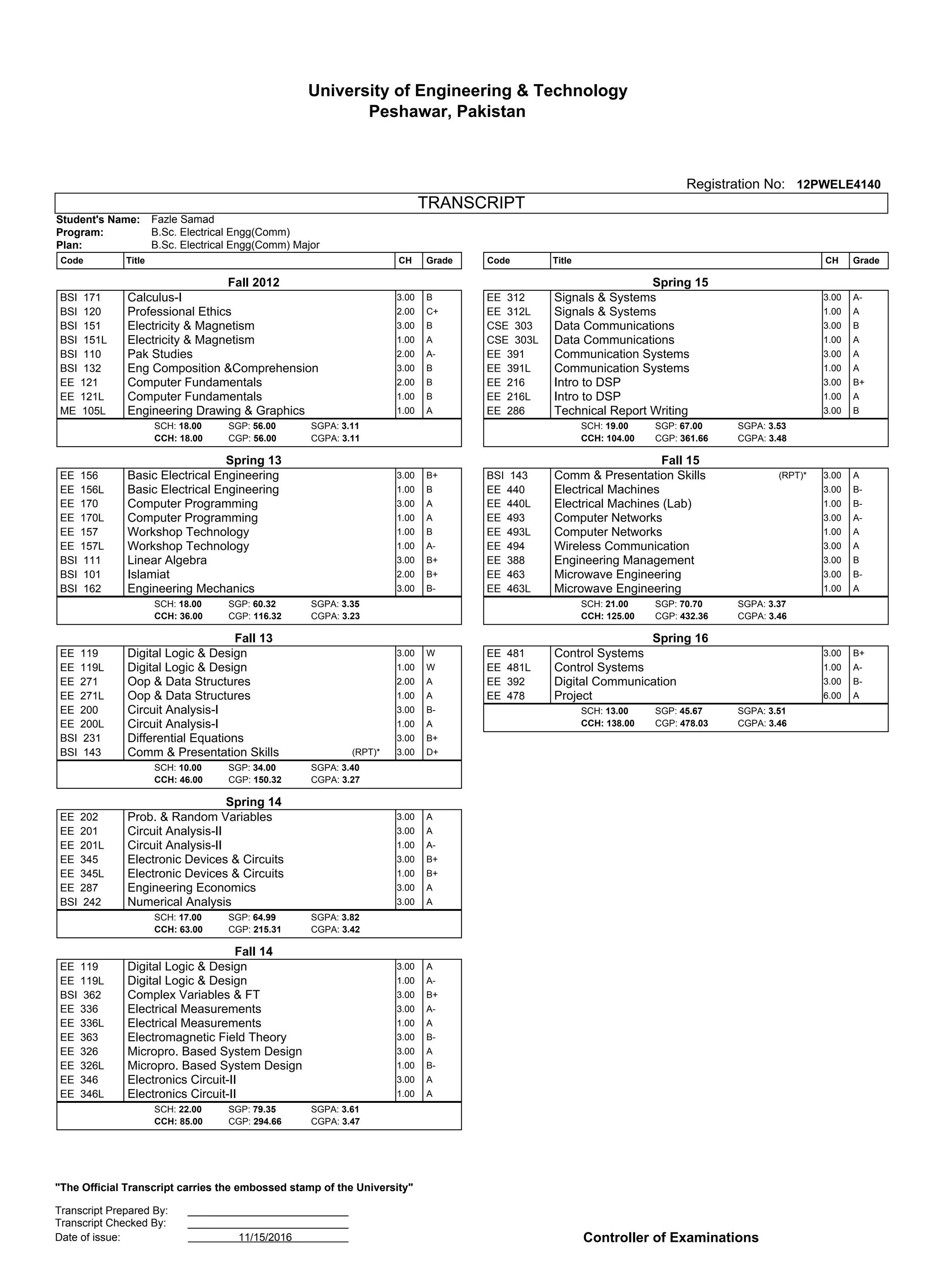 This transcript is for Fazle Samad, who studied Electrical Engineering at the University of Engineering & Technology in Peshawar, Pakistan. It shows his coursework and grades over 8 semesters from Fall 2012 to Spring 2016. Overall, Fazle maintained a grade point average of 3.46 out of 4.00 across 138 credit hours of study. His highest semester GPA was 3.82 in Spring 2014.