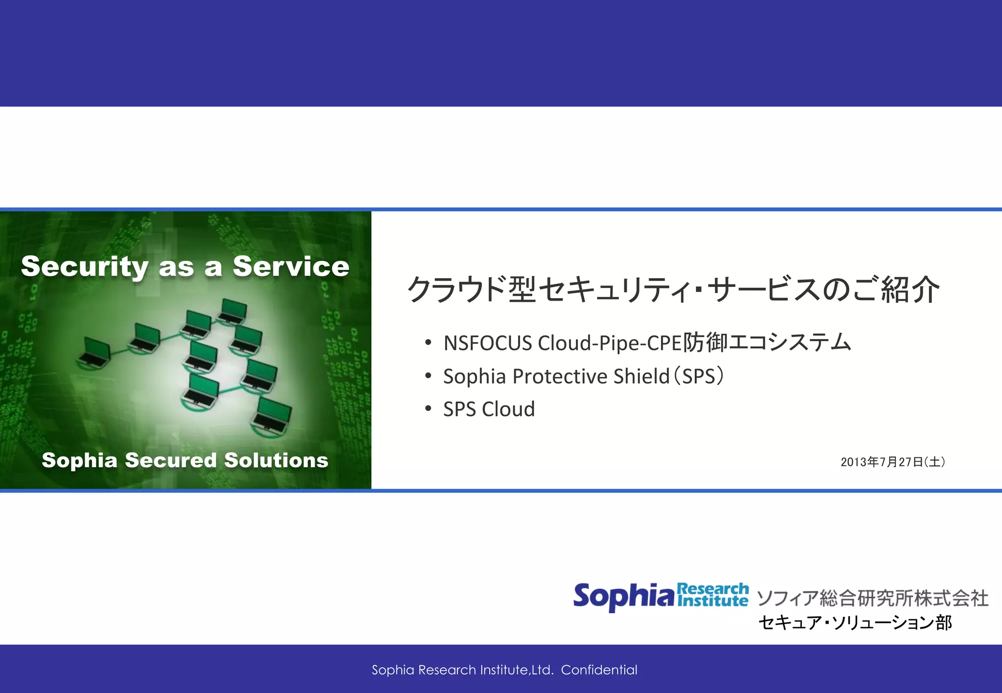 ソフィア総合研究所株式会社 セキュア・ソリューション部 http://www.sps.jp.net クラウド型セキュリティ・サービスの紹介資料です。 1. NSFOCUS Cloud-Pipe-CPE防御エコシステム 2. Sophia Protective Shield(SPS) 3. SPS Cloud ◆ ブログ記事 クラウド型セキュリティ・サービス(2) http://www.sps.jp.net/ssslog/cloud-security-20130728/