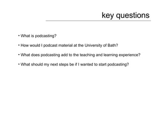This document discusses using podcasting in teaching and learning. It defines podcasting and how to create podcasts. It provides examples of how podcasting has been used in higher education, including distributing lecture recordings, supplemental educational materials, and having students create their own podcasts. It also discusses factors to consider for using podcasts, such as their effectiveness as a primary delivery method versus supplemental material and how they can be designed to promote active learning.