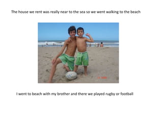 A 12-year-old went on holiday with their family to Carilo and had the best holidays of their life. They rented a house near the sea and spent their days playing sports like rugby and football on the beach with siblings and cousins. Evenings were spent playing at the kids center, and mornings were filled with swinging on swings and running in the ocean with family.