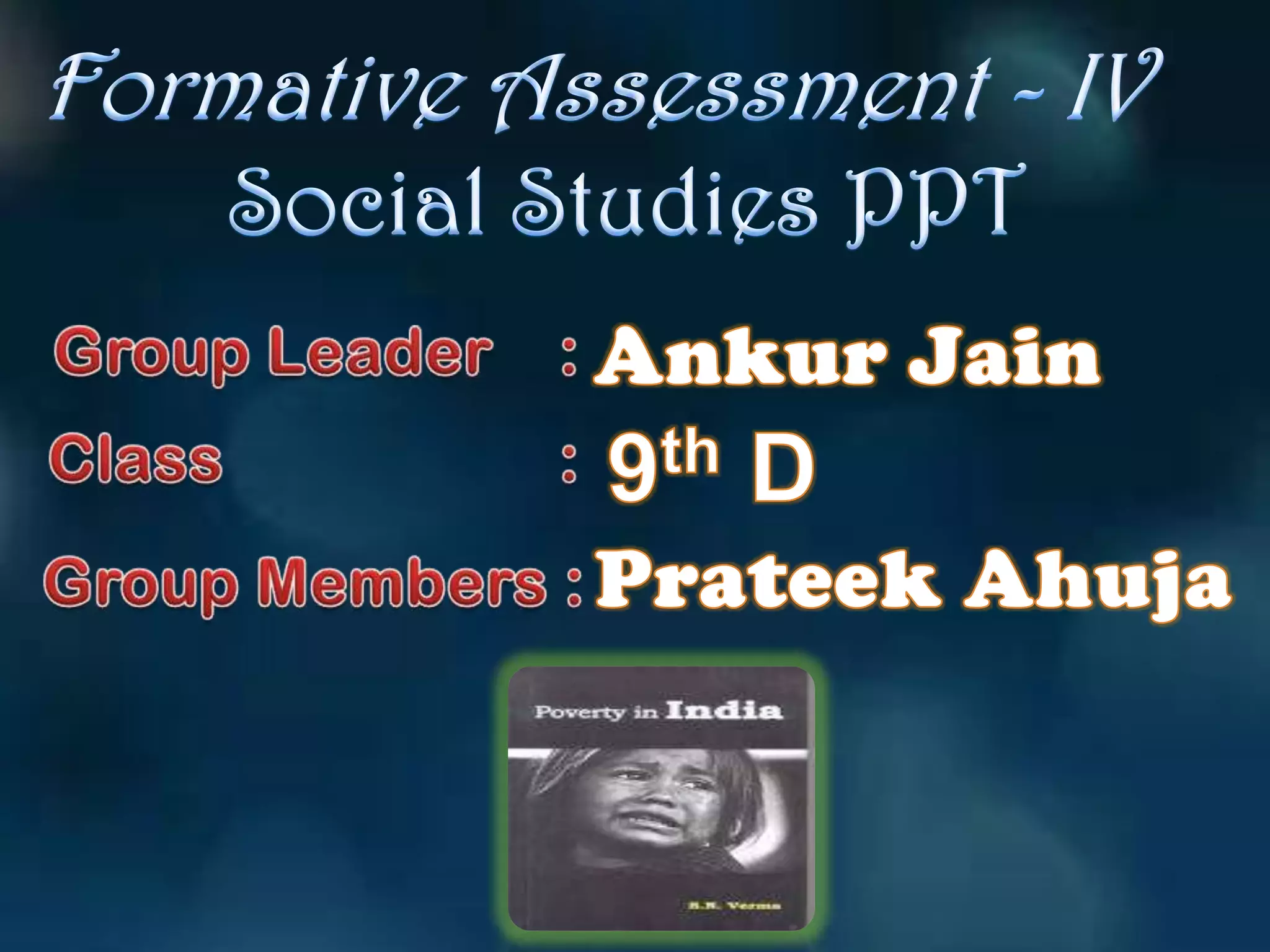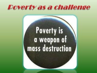 Poverty is defined as the lack of basic needs like food, clothing, and shelter. The World Bank describes poverty as hunger, lack of shelter, inability to access healthcare or education, unemployment, and living in fear without stability. There are two types of poverty - relative poverty which compares economic conditions between regions, and absolute poverty which measures minimum calorie intake and consumption levels. Poverty is measured using either expenditure or income methods to determine who falls below the poverty line, which indicates the minimum purchasing power required to meet basic needs. Vulnerable groups with high poverty rates in India include scheduled tribes, urban/rural laborers, and scheduled castes. Causes of poverty include historical factors like British rule, population pressure