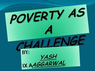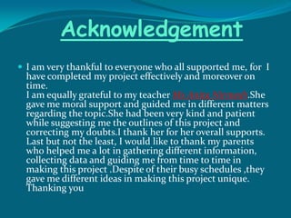 The document is about poverty in India. It begins by thanking those who supported the completion of a school project on time, including a teacher who provided guidance. It then outlines the contents of the project, which discusses definitions of poverty and poverty line, social exclusion, vulnerability, inter-state disparities, global poverty, causes of poverty in India, and anti-poverty programs by the government.