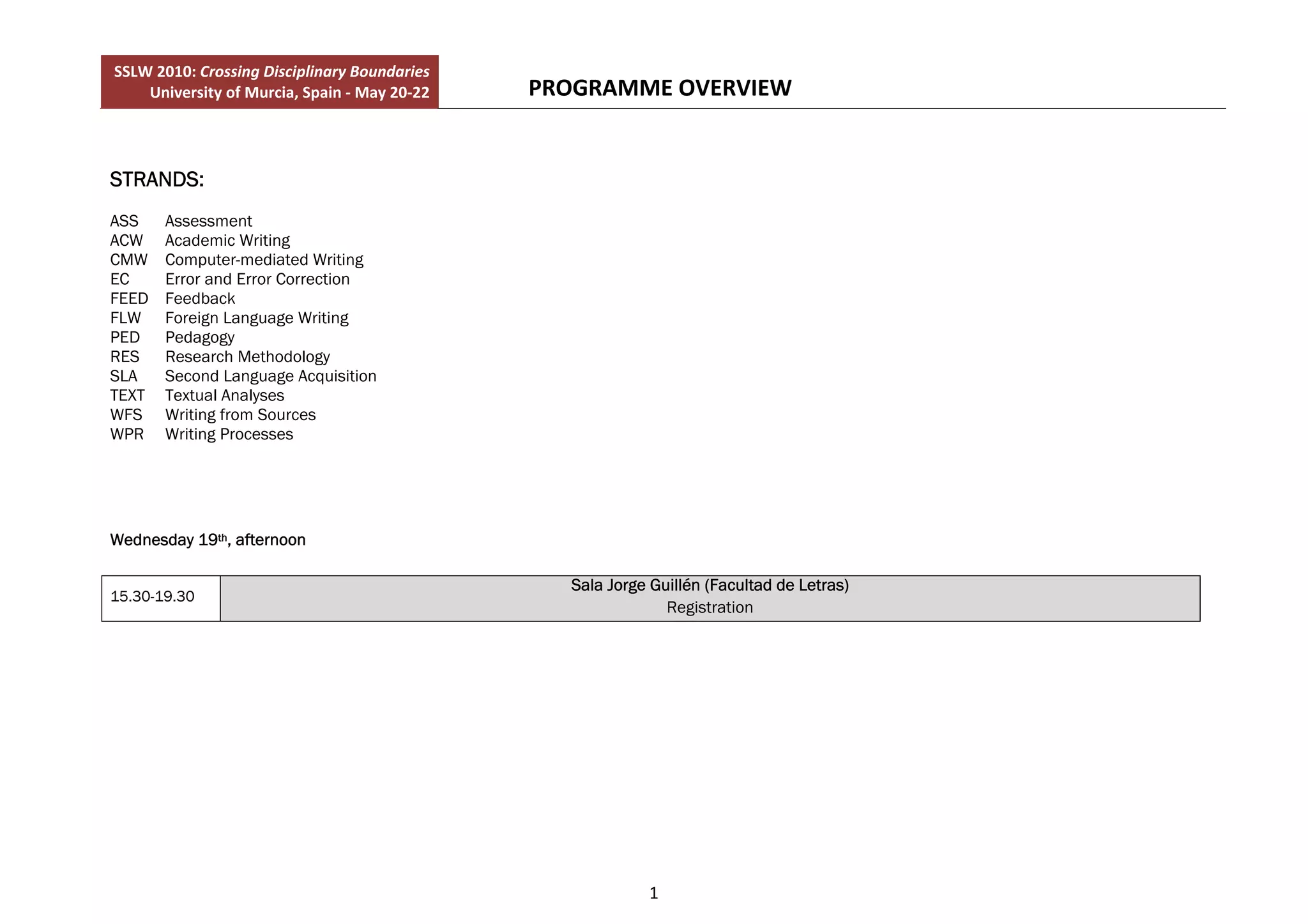 This document provides an overview of the program for the SSLW 2010 conference on second language writing held at the University of Murcia in Spain from May 20-22. The conference featured plenary sessions, special sessions, invited colloquia, and presentations organized around 11 strands of second language writing research. Presentations explored topics such as academic writing, writing assessment, genre, feedback, and connections between writing and disciplines.