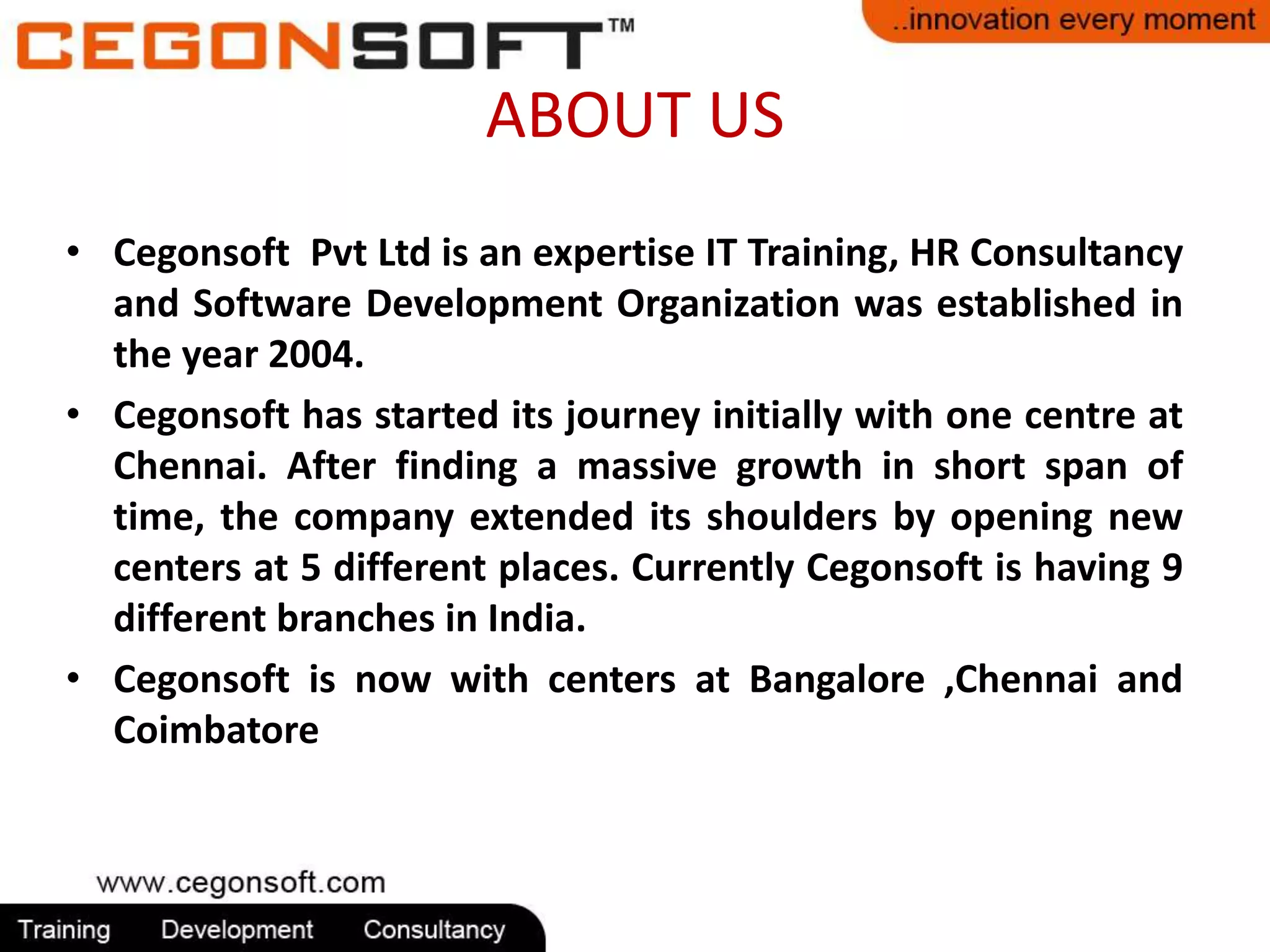 Cegonsoft Pvt Ltd is a software training, development, and HR consultancy company established in 2004 in Chennai, India. It now has 9 branches across India providing a variety of IT training courses. Its services include software development through its division I3IT, IT training programs for freshers and job seekers covering topics such as Java, .NET, and software testing, and HR consultancy to help people find jobs in IT companies.