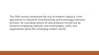The 19th century witnessed major advances in science and technology, including the formulation of atomic theory, the periodic table, the law of conservation of energy, and discoveries in physics like the electron. Important innovations included the electric telegraph, dynamo, and transition to electricity powering machines. Science and technology continued advancing in the 20th century with computers, the internet, artificial intelligence, and other breakthroughs. The Philippines has a long history of science and technology dating before the Spanish arrival, and its development has been influenced by Spanish colonization, American rule, and emphasis under Marcos and subsequent governments.