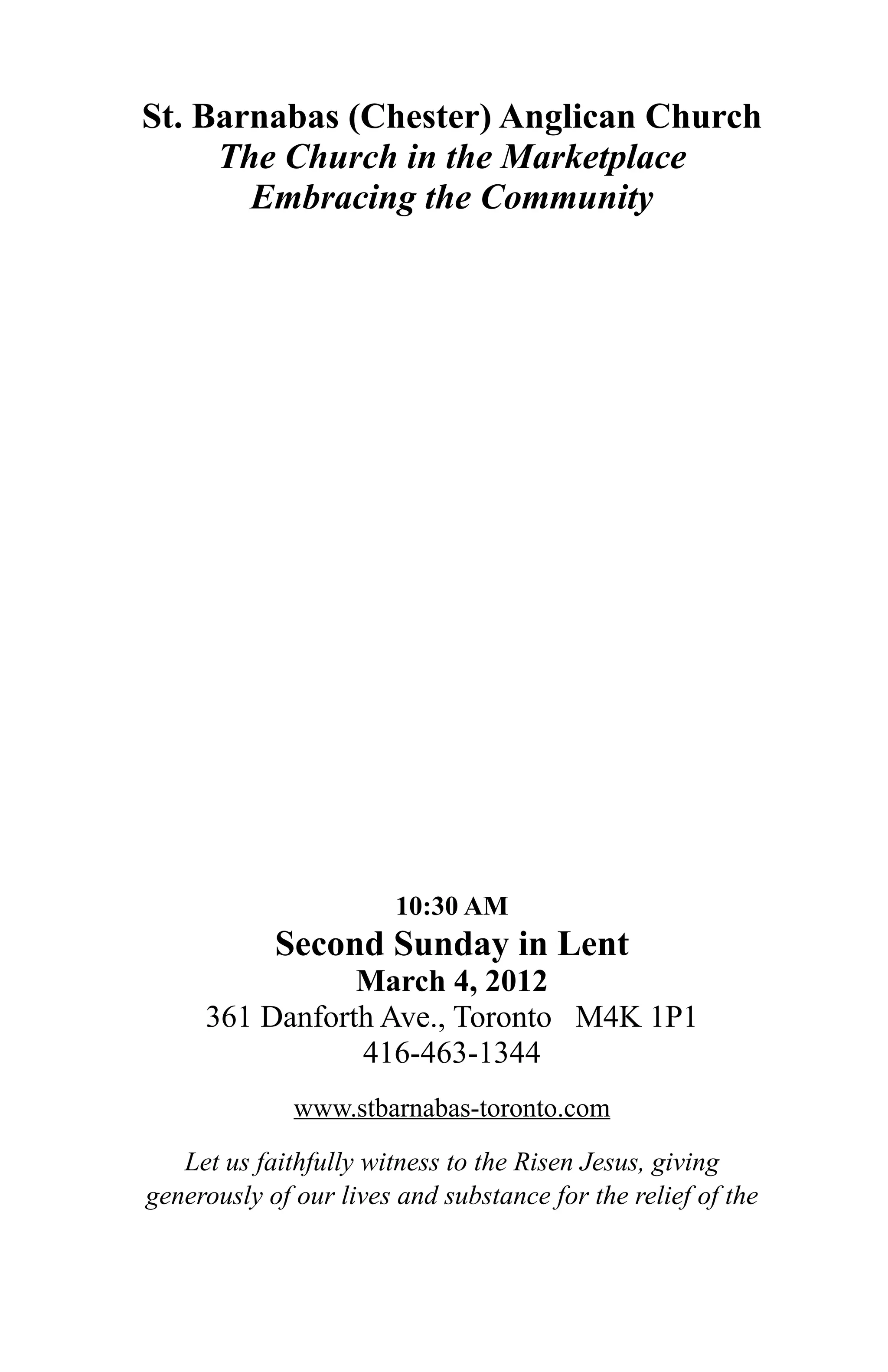 1) The document announces an upcoming service at St. Barnabas (Chester) Anglican Church on March 4, 2012 for the Second Sunday in Lent. 2) The 10:30 AM service will include readings from Genesis 17:1-7, 15-16 and Mark 8:31-38, hymns, and a homily by Rev. Grace Caldwell-Hill. 3) Announcements provide information about upcoming Lent