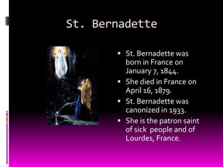 St. Bernadette was born in France in 1844, had 18 visions of Mary at a grotto between 1858-1879, and died of tuberculosis in 1879. She is the patron saint of sick people and of Lourdes, France where she received messages from Mary to do penance, pray for sinners, and that Mary identified herself as the Immaculate Conception.