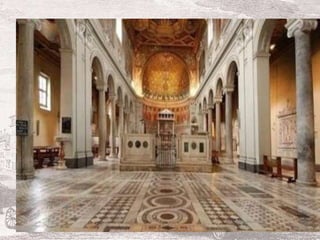St. Clemente in Rome is a three-tiered basilica built on the site of earlier religious structures. The lowest level contains remnants from a 1st century home that was later used as a mithraeum in the 2nd century. In the 4th century, this space was filled in and a lower basilica was constructed. The current basilica was rebuilt in 1100 AD in a classical basilical style with arcades, aisles, and an apse. Beneath the modern church, the remains of the earlier religious sites can still be seen.