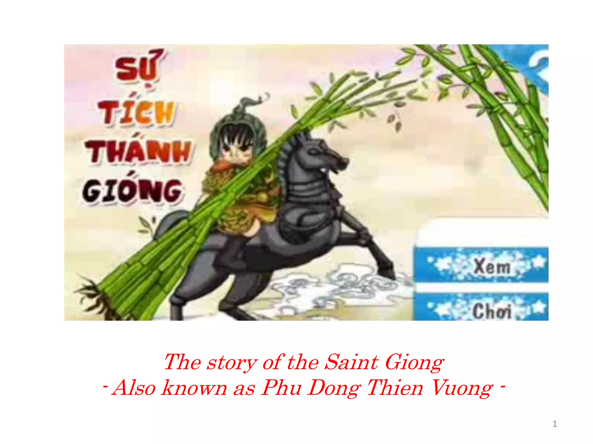 King Hung the sixth was defending Vietnam from invaders when he heard of a 3-year-old boy named Giong who had not yet spoken but was growing quickly. Giong asked the king's messenger for armor, a helmet, and an iron horse to help fight the invaders. Giong rode into battle wielding a whip and bamboo branch, defeating the invaders. After his victory, Giong rode up to heaven from Soc Son Mountain, and a temple was built in his honor. His victory is still commemorated annually in Vietnam.
