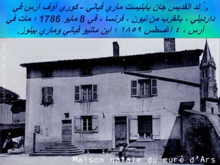 تتناول الوثيقة حياة القديس جان فياني، الذي وُلد في 8 مايو 1786 وبرز ككاهن في مارسيليا. أسس دارًا للأيتام وقدم تعاليم مسيحية مهمة، عُرف بتواضعه ومحبته للناس، وأثر بشكل كبير على المجتمع من حوله من خلال تقديم المساعدة الروحية والمادية. قدم خلال حياته مثالاً على الإيمان والقداسة، مما جعله قديسًا مؤثرًا في التاريخ الكنسي.