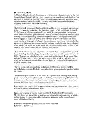 St Martin's Island is a small conservation reserve located in Otago Harbour near Dunedin, New Zealand. The island has been leased by the St Martin's Island Community for over 50 years, who are committed to maintaining the historical, ecological, and human aspects of island life. Facilities on the island are basic, including an old lodge that sleeps 30 people, a kitchen, and outdoor toilets. Visitors are encouraged to enjoy the natural environment and simple lifestyle free from distractions. Values of love, respect and care for both people and the environment are central to the community of St Martin's Island.