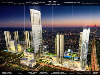 This document provides a site plan and details for three condominium towers - the Presidential Suite Tower, Ambassador Suite Tower, and Royal Suite Tower. It outlines the bedroom concepts, minimum and maximum unit sizes ranging from 88 to 265 square meters, and kitchen configurations including wet kitchens, dry kitchens, islands, and serving windows. The developer does not offer units smaller than 88 square meters due to international standards, oversupply of small units, and lack of livability for families.