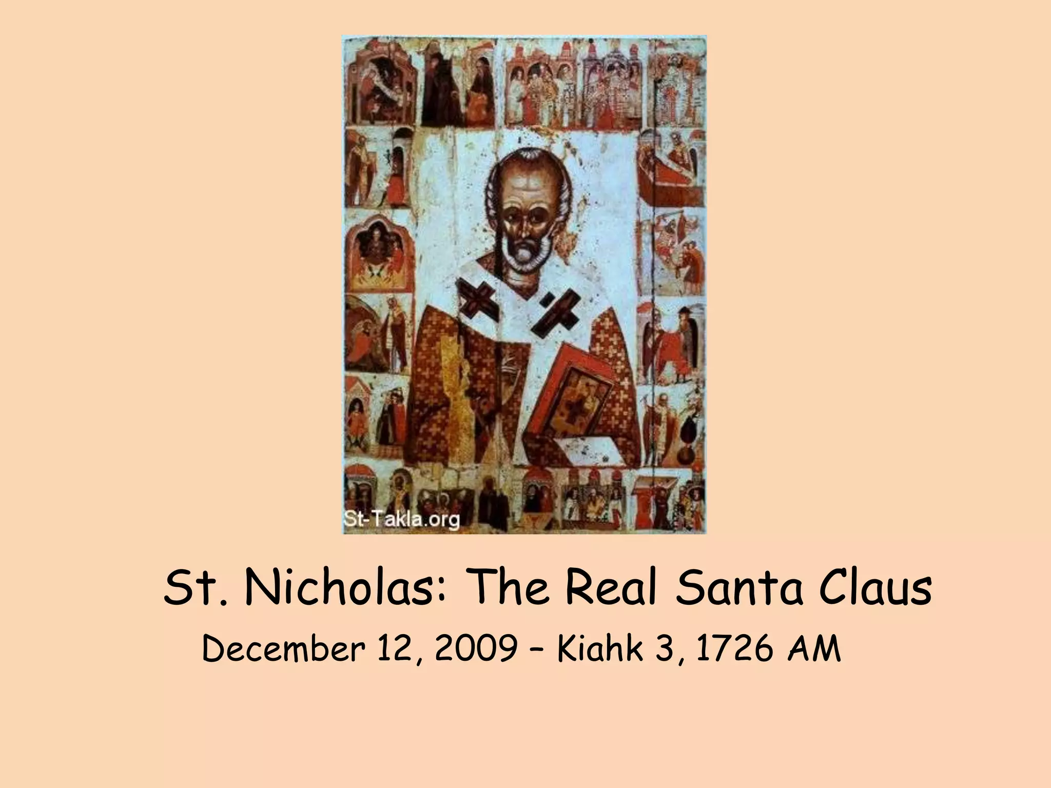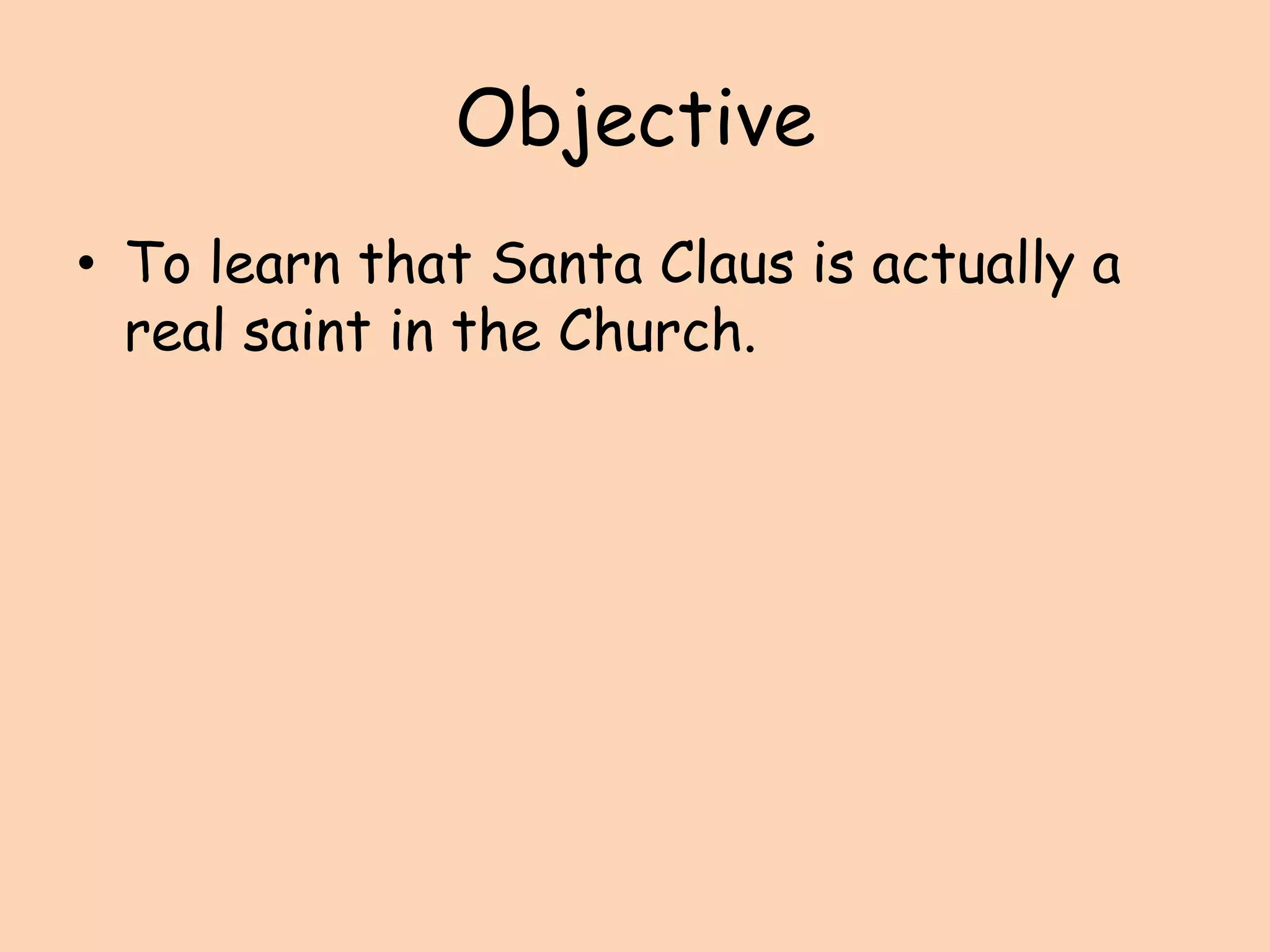 St. Nicholas was a real saint from Turkey who lived in the 3rd century AD. He was known for his generous giving, especially anonymously helping a poor man by throwing bags of gold into his house on three occasions to help dowry his daughters. This act of charity is believed to be the origin of the Christmas tradition of Santa Claus or Father Christmas bringing gifts. The document teaches that Santa Claus, Baba Noel, and St. Nicholas all refer to the same historical saint who set an example of generosity that is still celebrated today.