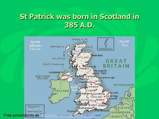 St Patrick was born in Scotland in 385 A.D., became a priest and went to Ireland to teach people about God, using shamrocks to teach about the Trinity, and died on March 17, 461 A.D.; leprechauns possess a pot of gold that can be tricked from them if watched carefully but they will disappear; today on St. Patrick's Day, Americans celebrate with parades, dancing, and wearing green in memory of Ireland and shamrocks for luck.