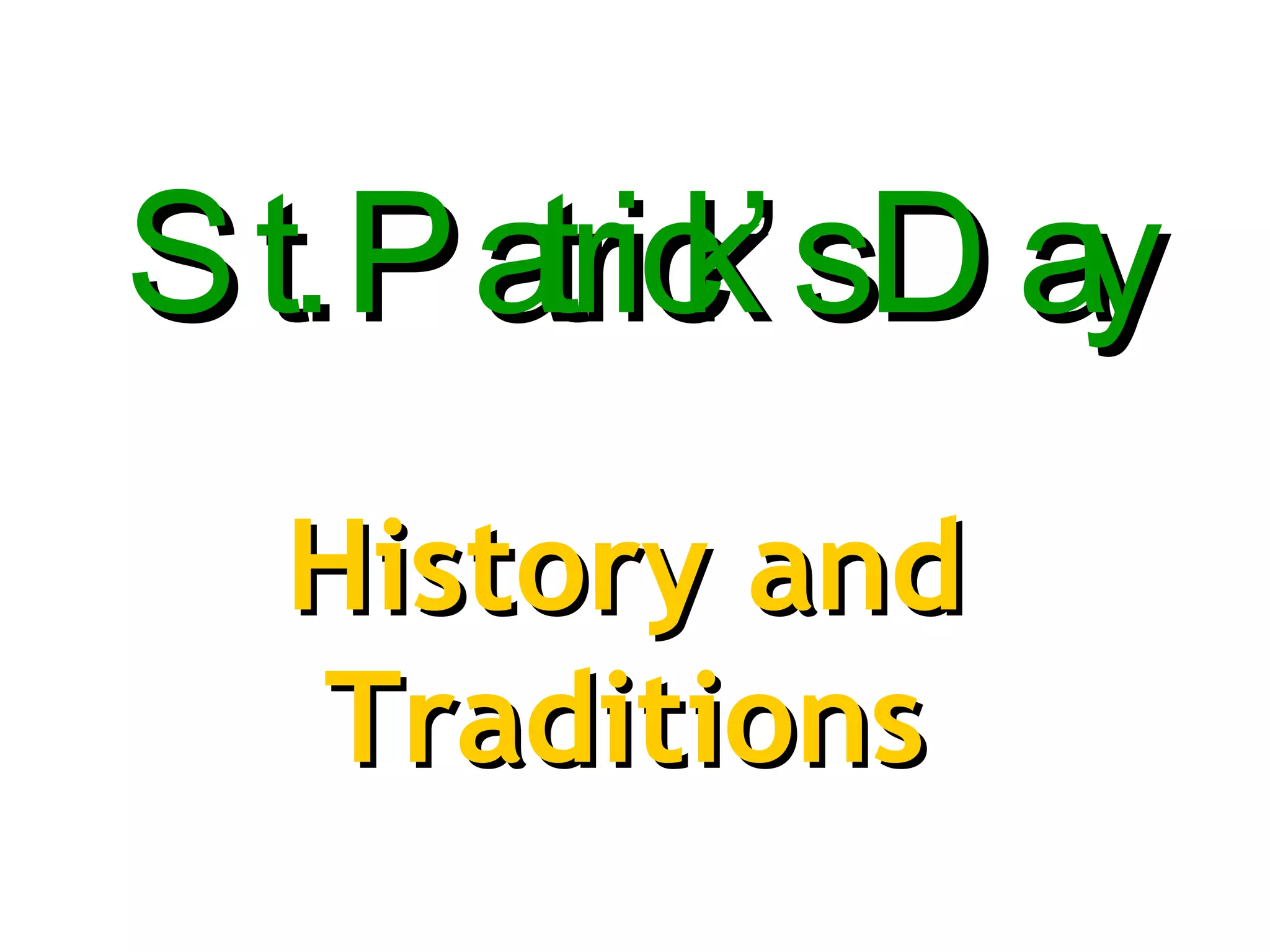 St. Patrick's Day commemorates St. Patrick, the patron saint of Ireland. It has evolved from a religious holiday to a worldwide celebration. Traditions include attending church, celebrating with food and drink, and wearing green. Symbols of Ireland like the shamrock and Celtic cross are prominent. The Chicago River is dyed green each year on March 17th.