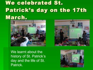The class celebrated St. Patrick's Day on March 17th by learning about the history and life of St. Patrick. They colored pictures of leprechauns and shamrocks, watched videos, and Marta made a shamrock out of sweets. They also made a card for their head teacher Patricia, and Juliet wore green to get into the St. Patrick's Day spirit.