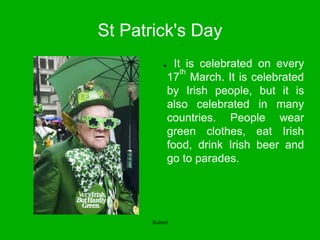 St. Patrick's Day is celebrated on March 17th. It originated as a Christian holiday but has also become a celebration of Irish culture. Traditions include wearing green, eating Irish foods like bacon and cabbage, drinking beer, and attending parades. The shamrock symbolizes the Christian holy trinity and was used by St. Patrick to explain it to the Irish. St. Patrick established Christianity in Ireland in the 5th century and is credited with banishing snakes from the island.