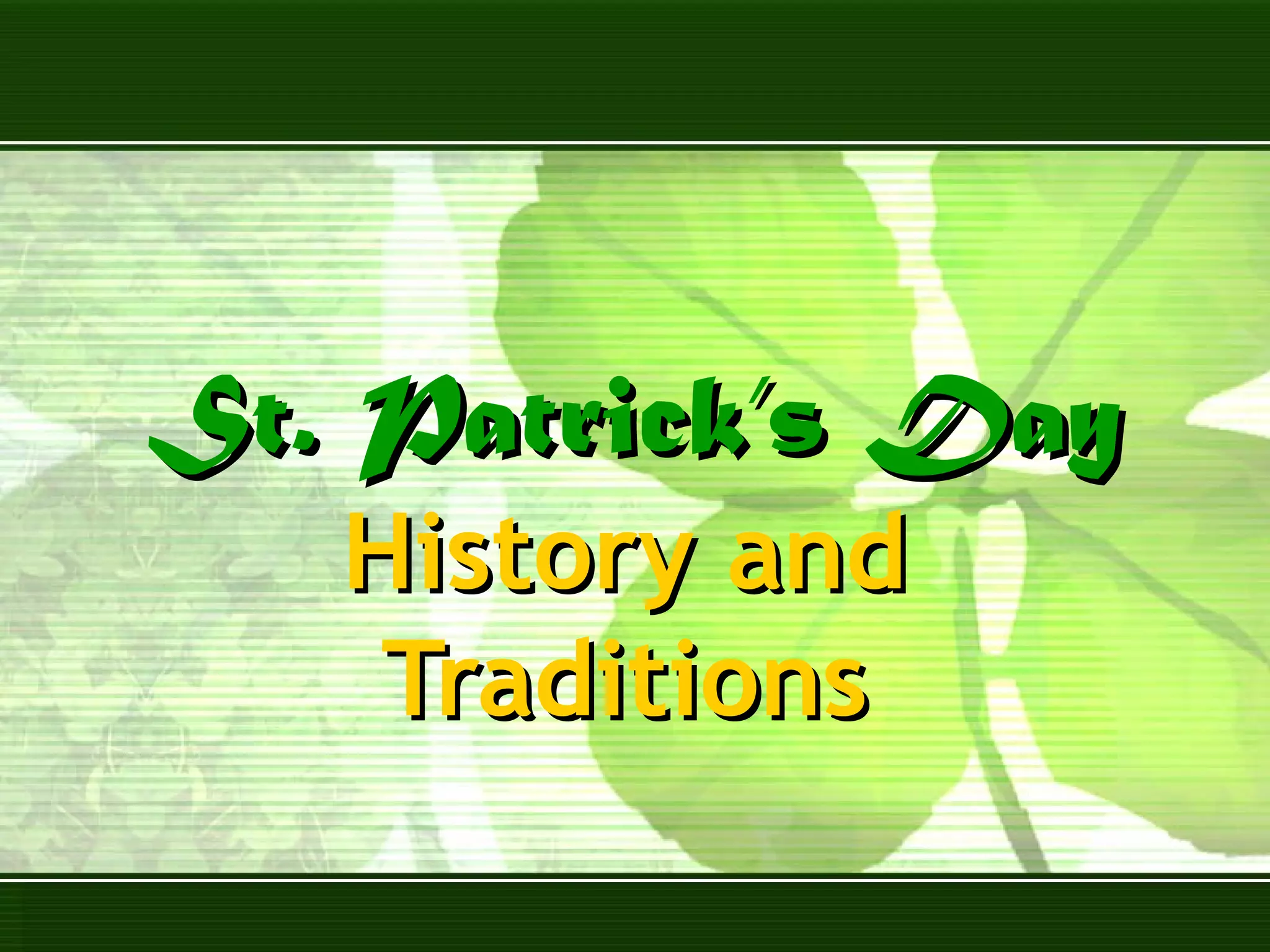 St. Patrick was a 5th century missionary who converted many Irish to Christianity. He incorporated Celtic symbols like the shamrock into Christian teachings. St. Patrick's Day on March 17th evolved from a religious holiday honoring his death to a global celebration of Irish culture. Traditions include attending church, lifting Lent restrictions to eat bacon and cabbage, dyeing the Chicago River green, and marching in parades. Symbols like the Celtic cross and shamrock represent the blending of Celtic and Christian beliefs. Music and names are also part of Irish cultural heritage celebrated on St. Patrick's Day.