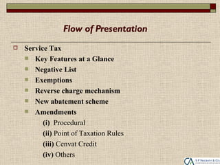 The document summarizes key changes to India's service tax laws effective July 1, 2012. Key points include: