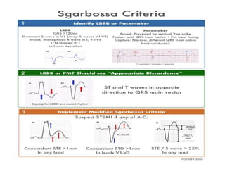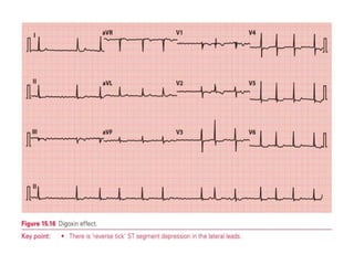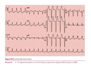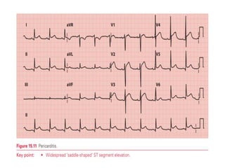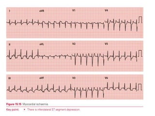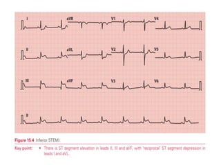 The document discusses the ST segment of the ECG and various abnormalities that can occur. It notes that the ST segment represents the interval between ventricular depolarization and repolarization. ST segment elevation or depression can indicate myocardial ischemia or infarction. Various conditions are described that can cause ST segment changes, including myocardial infarction in different coronary artery territories, coronary vasospasm, pericarditis, early repolarization, and others. The morphology and patterns of ST segment abnormalities are discussed for evaluating these conditions.