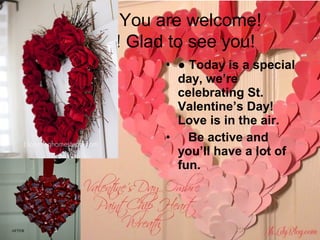 This document discusses the history and traditions of Valentine's Day. It provides background on how the holiday originated from ancient Roman festivals and later Christian martyrs. It discusses common Valentine's Day traditions like exchanging cards, candy, gifts and flowers. It also shares interesting facts about the popularity of heart-shaped boxes of chocolate, roses as a symbol of love, and how much business florists and chocolate companies see on Valentine's Day each year.