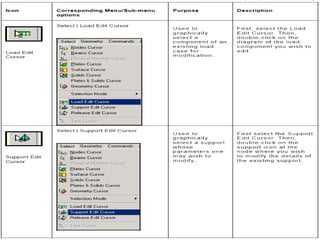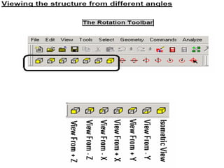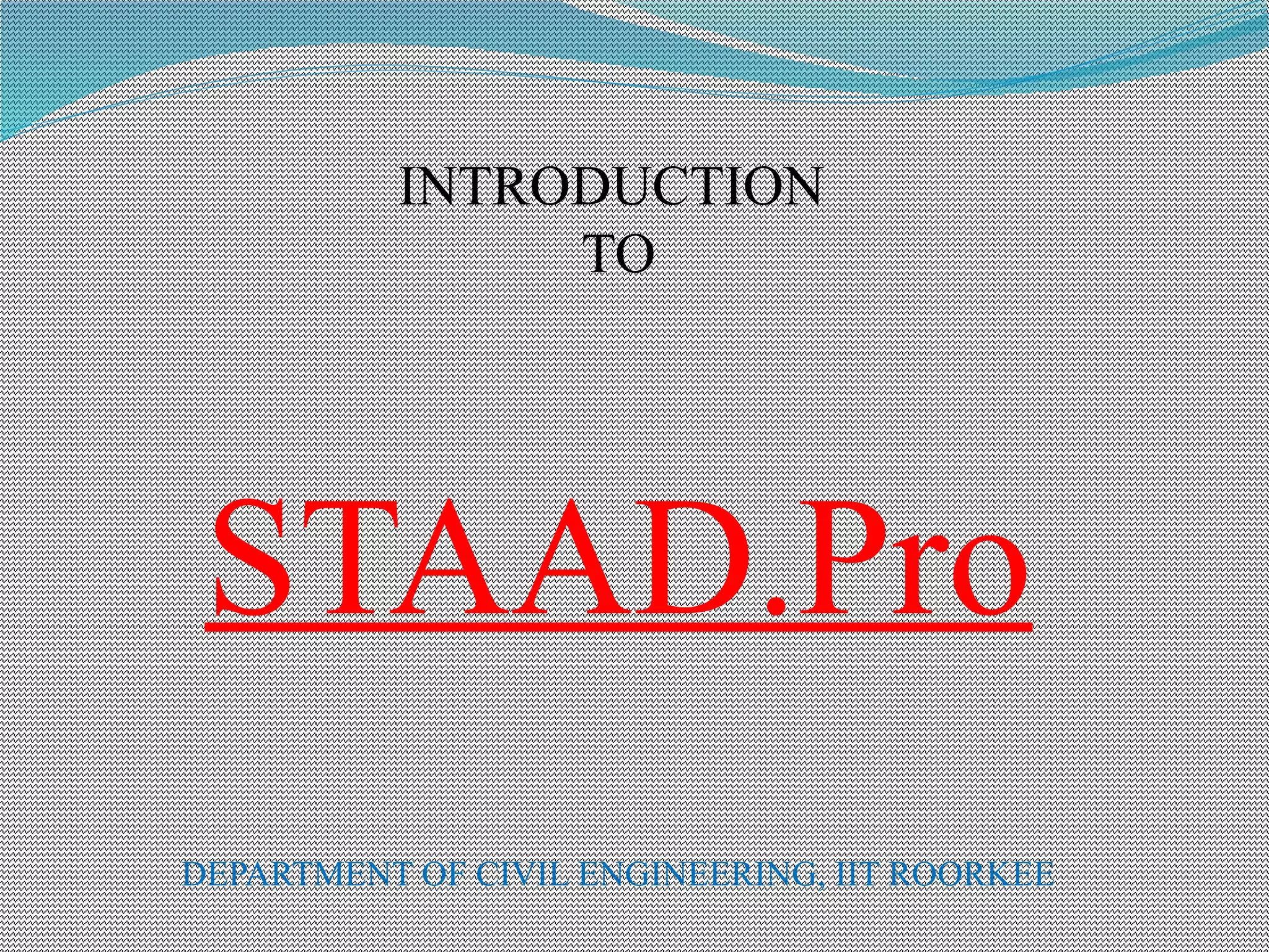 This document provides an introduction and overview of the modules covered in a training course on STAAD.Pro. It outlines 9 modules that will be covered: 1) Introduction, 2) Geometry creation, 3) Additional modeling tools, 4) Property assignments, 5) Constants, supports and specifications, 6) Loading, 7) Analysis, 8) Post-processing, and 9) Design. Each module provides a brief description of the topics and functionality that will be covered related to that aspect of using STAAD.Pro for structural analysis and design.