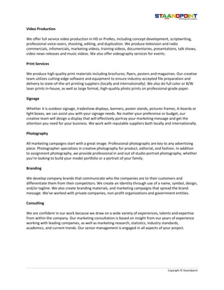 We are a full-service advertising agency that provides creative solutions for clients. We offer services including web development, graphic design, video production, print services, signage, photography, branding, and marketing consultation. Our goal is to understand clients and deliver innovative and effective solutions that achieve their objectives.
