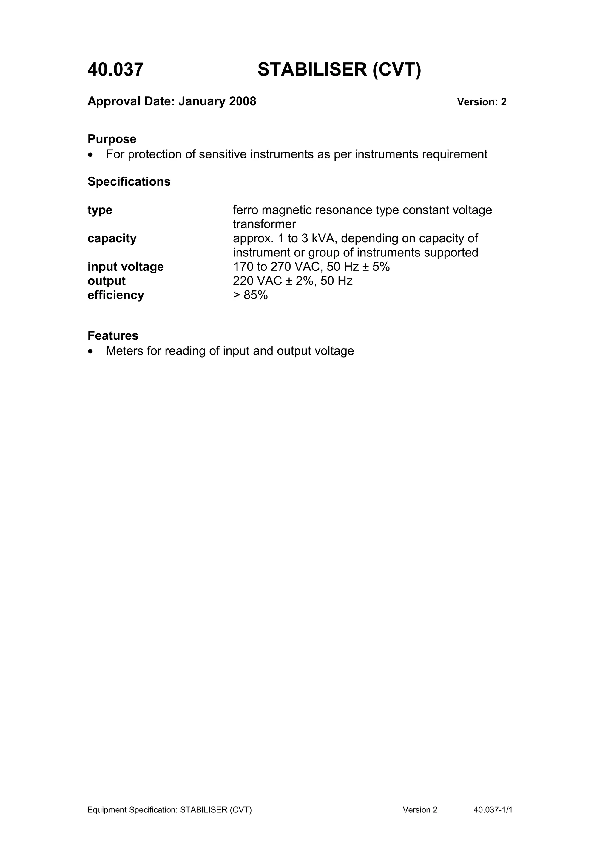 This document provides specifications for a stabiliser (constant voltage transformer) used to protect sensitive instruments. The stabiliser is a ferro magnetic resonance type that maintains an output of 220 VAC ± 2% from an input of 170-270 VAC at 50 Hz. It has a capacity of 1-3 kVA depending on the instruments, is more than 85% efficient, and includes input/output voltage meters.