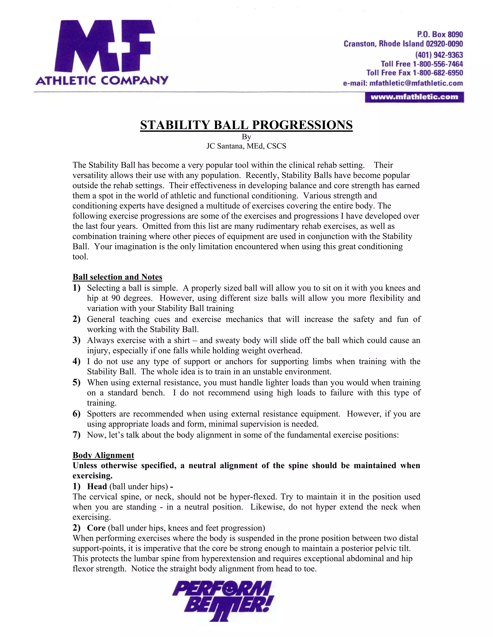 This document provides exercise progressions using a stability ball to develop strength, balance, and core stability. It begins with guidelines for ball selection and exercise technique. Exercise progressions are then outlined for the chest, shoulders, back, hips, legs, and core using both bodyweight exercises and adding external resistance. Exercises progress from two-point to one-point balance and support, and involve movement between different areas of ball support to increase challenge.