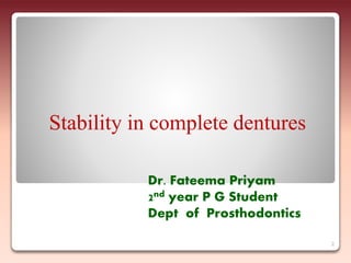 This document discusses factors that influence the stability of complete dentures. It defines stability as the quality of a removable prosthesis to resist displacement from functional stresses. The three main factors discussed are: