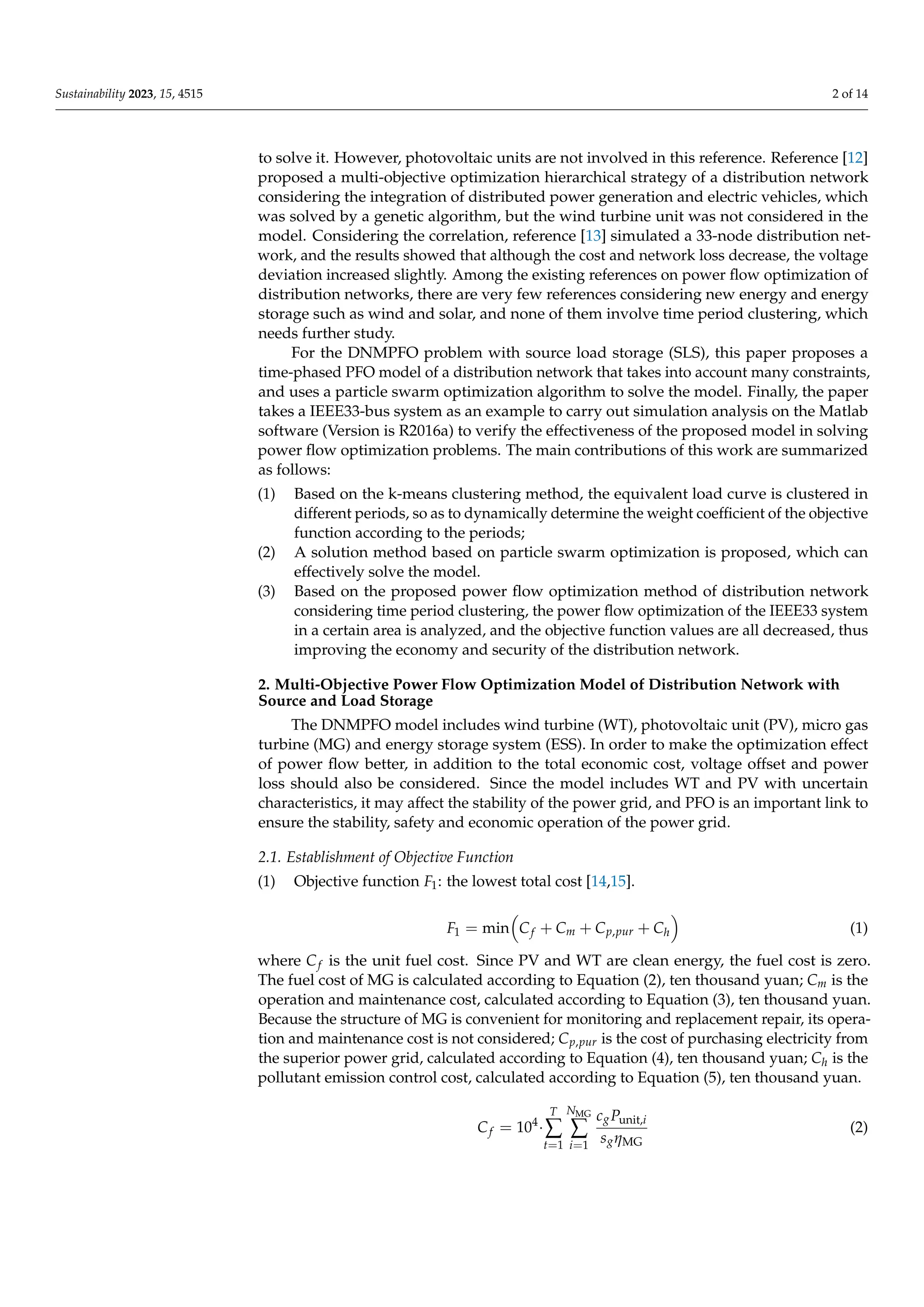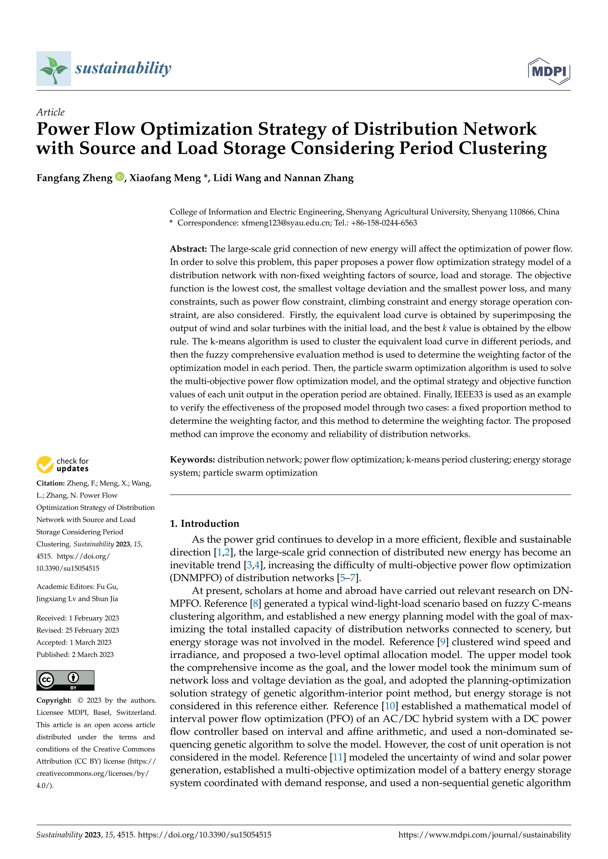 This document presents a power flow optimization strategy model for a distribution network that considers source, load, and storage. The model aims to minimize total cost, voltage deviation, and power losses over time periods determined through k-means clustering of an equivalent load curve. A particle swarm optimization algorithm is used to solve the multi-objective optimization model subject to power flow, voltage, and other constraints. The model is tested on an IEEE 33-node system and is shown to improve economic and reliability performance compared to a fixed weighting approach.