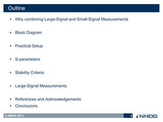 The document discusses the importance of combining large-signal and small-signal measurements using a vector network analyzer for characterizing amplifiers and assessing stability. It outlines practical setups, measurement techniques, and the impact of spurious and interference signals, emphasizing the value of s-parameters in analyzing amplifier behavior. Conclusions highlight the simplicity of using a Rohde & Schwarz network analyzer for achieving comprehensive insights into both small-signal and large-signal conditions.