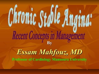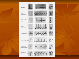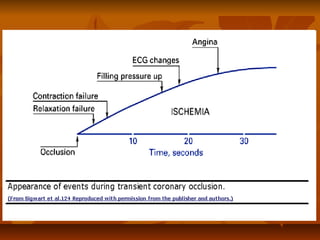 Angina pectoris is a recurrent chest pain or discomfort caused by myocardial ischemia. The document defines angina and provides historical context, summarizes the pathophysiology involving an imbalance between myocardial oxygen supply and demand, and lists various clinical presentations and classifications of angina. It also discusses investigations like exercise stress testing and identifies high-risk features, and outlines management approaches.