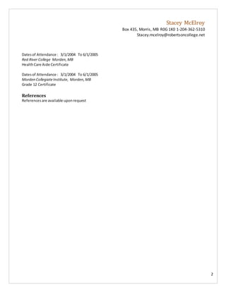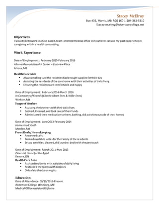 Stacey McElroy is seeking a position in a fast-paced medical office where she can use her experience in caregiving. She has over 5 years of work experience in healthcare roles, including as a healthcare aide at a care home and supporting two brothers in their home. Currently, she is studying to become a medical office assistant at Robertson College in Winnipeg. She has a healthcare aide certificate from Red River College and a high school diploma. References are available upon request.
