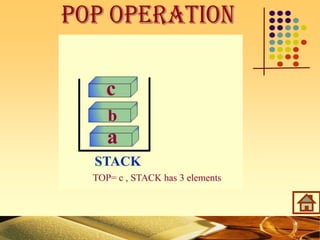 This document discusses stacks and their applications. It defines a stack as a Last In First Out (LIFO) data structure where newly added items are placed on top. The core stack operations of PUSH, POP, and PEEK are described. An array implementation of stacks is presented and animations demonstrate push and pop operations. Applications of stacks like checking for balanced braces, converting infix to postfix notation, and postfix calculators are explained with examples. Pseudocode provides an algorithm for infix to postfix conversion using a stack.
