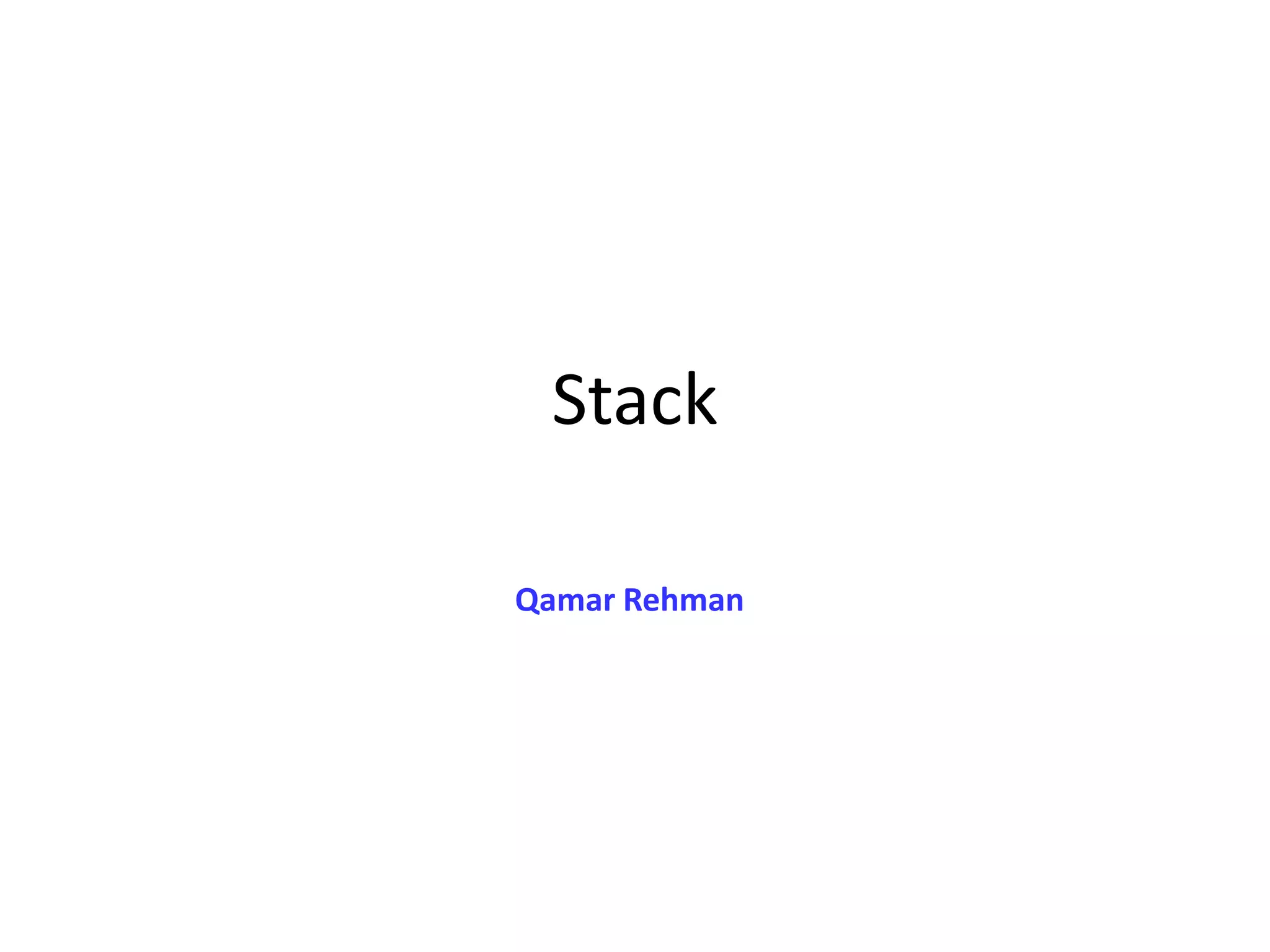 This document discusses stacks, which are a type of list where insertions and deletions only occur at one end, called the top. Stacks follow a last-in, first-out (LIFO) ordering. Common stack operations include push, which inserts an element at the top, and pop, which removes the top element. Stacks can be implemented using either static arrays or dynamic linked lists. The document then provides an example C++ implementation of a stack using an array, including member functions for push, pop, isFull, and isEmpty. It demonstrates pushing and popping values from the sample stack.