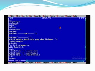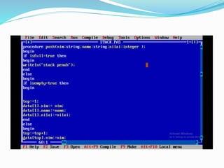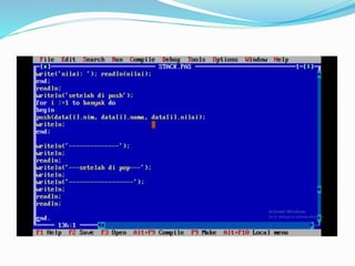 Stack (tumpukan) adalah koleksi data yang disusun secara berurutan dengan prinsip Last In First Out, di mana elemen terakhir yang dimasukkan akan menjadi elemen pertama yang diambil. Stack memiliki kelebihan operasi penambahan dan penghapusan data yang cepat namun memerlukan memori lebih besar dibanding struktur data lainnya. Operasi utama pada stack adalah push untuk menambahkan data dan pop untuk menghapus data.
