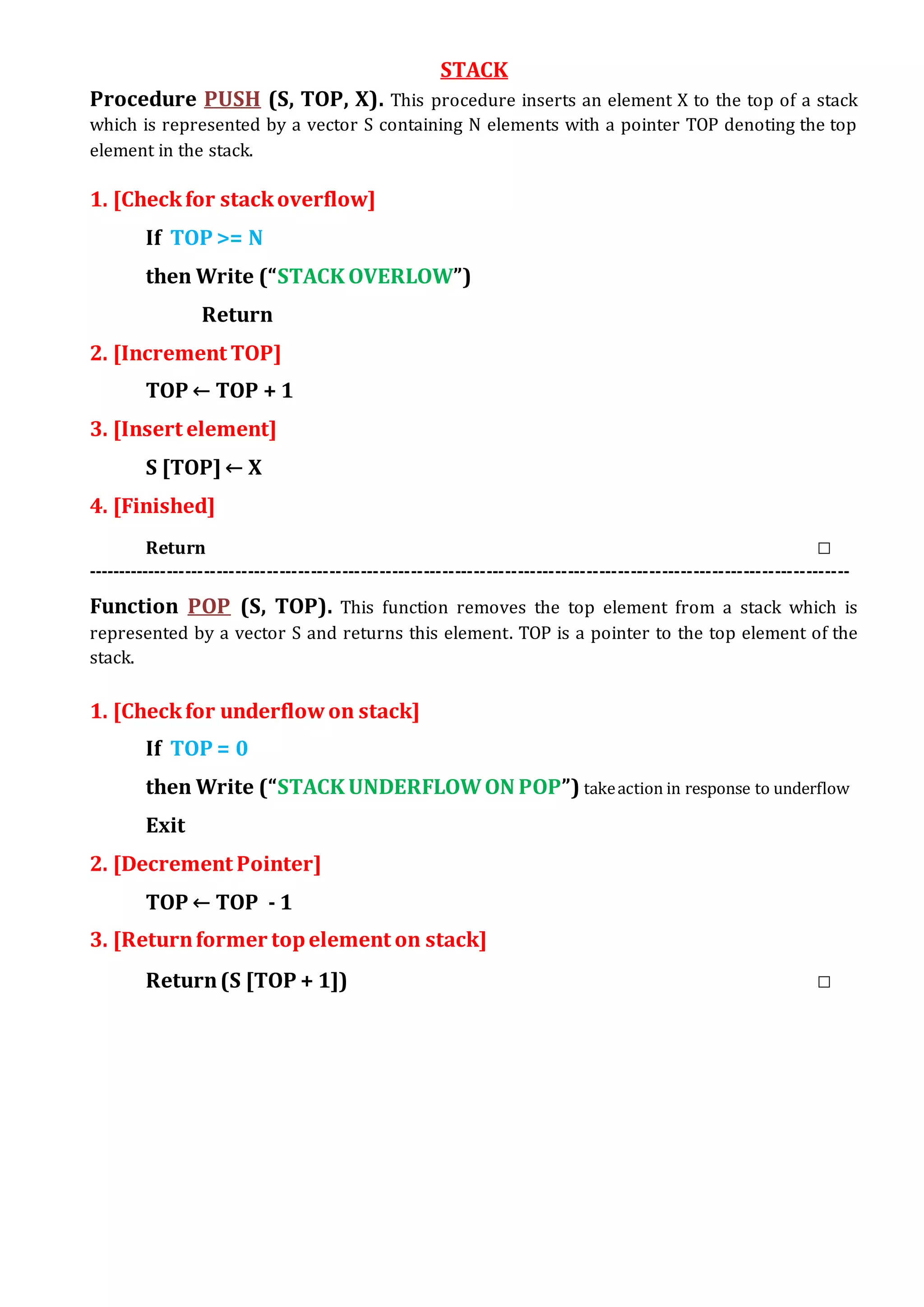 The document describes procedures and functions for implementing various data structures like stacks, queues, linked lists, and doubly linked lists. It includes operations for pushing/popping elements to/from stacks, inserting/deleting elements from queues and linked lists, and inserting/deleting nodes from doubly linked lists while maintaining pointers between nodes. The procedures/functions check for errors like overflow/underflow and update relevant pointers and fields during operations.