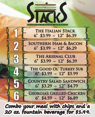 This menu lists 6 sandwich options ranging in price from $3.29 to $4.59 for a 6-inch sub and $5.99 to $6.89 for a 12-inch sub. Customers can also combo their sandwich with chips and a 20 oz drink for $1.99.