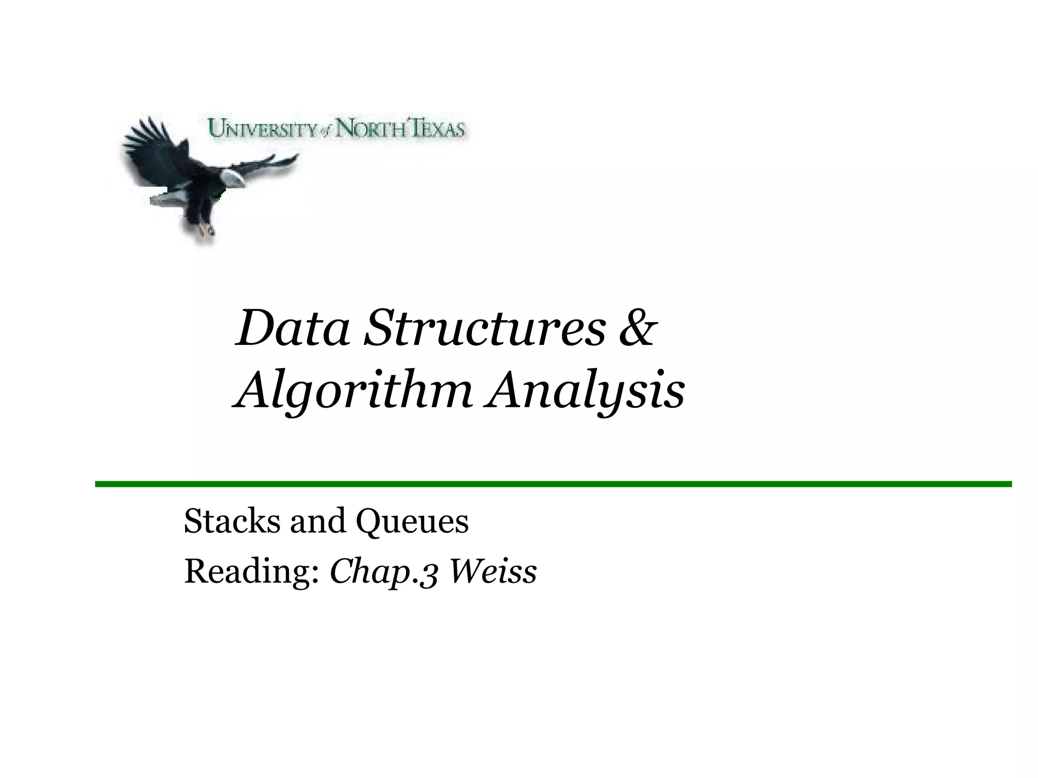 This document discusses data structures and algorithms for stacks and queues. It describes the common operations for stacks and queues like push, pop, enqueue, dequeue. It provides array-based and linked list-based implementations for both stacks and queues. For queues, it discusses two implementations using arrays: one using front and rear indexes, and another using a circular queue approach. The time complexities of common operations on stacks and queues are also analyzed.