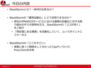 本プレゼンテーションでは、こういった「運用の自動化」に対する課題を、StackStormを活用することでどのように解決していけるのか、弊社インターネットマルチフィードにおけるJPNAPサービスの運用自動化での実例を交えながら、ご紹介いたします。
