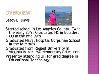 Stacy Davis provides a personal timeline of her educational experiences and how educational technology has changed over time. She started school in the early 1980s when there were no computers in schools yet. By the late 1990s, when she graduated from college, computers were being used more widely with PowerPoint presentations and computer labs. Now in graduate school, she sees technologies like tablets, Skype, and smart boards being used to enhance learning.