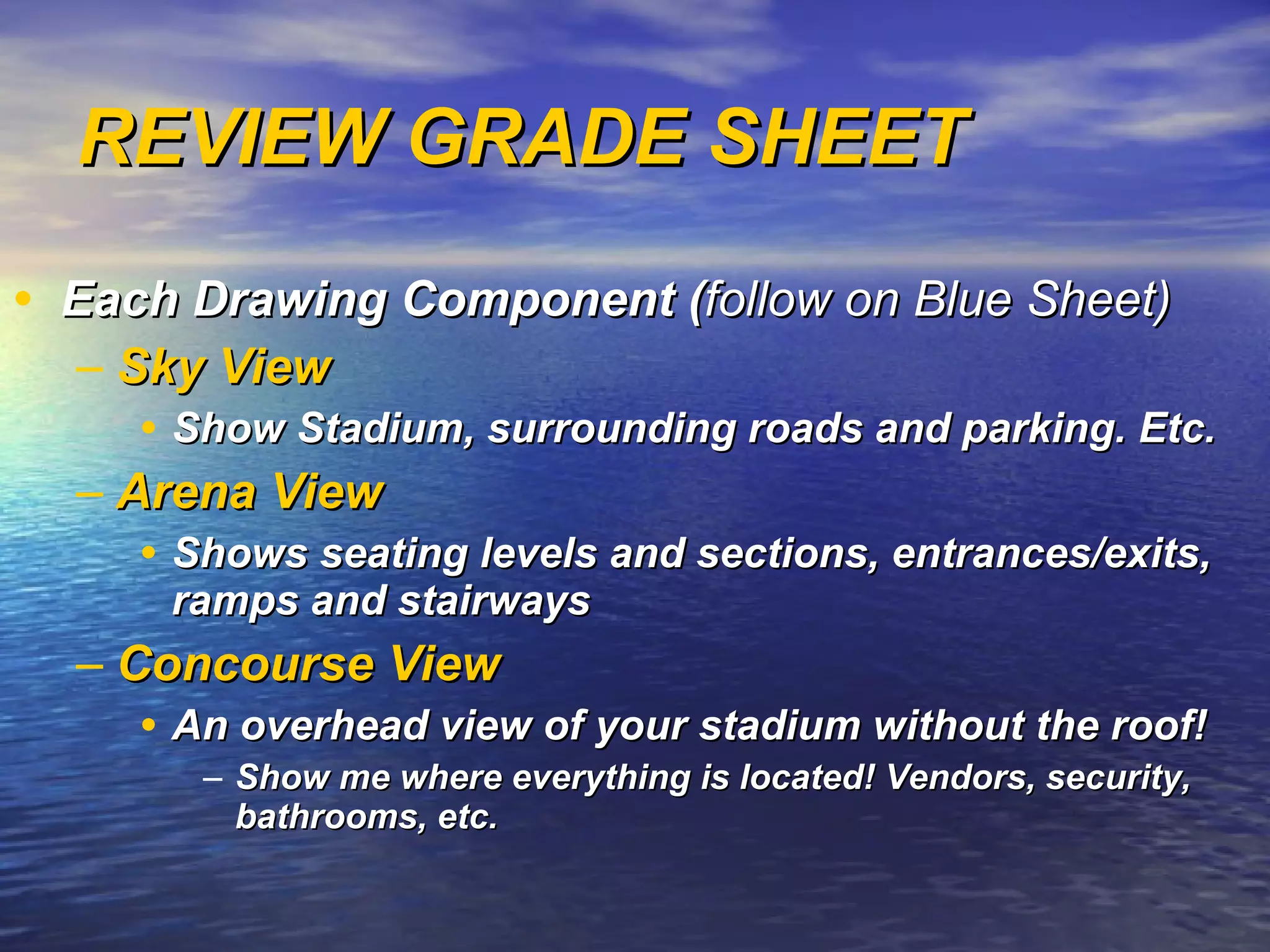 The document provides instructions for a stadium design project. Students must complete several drawings for their proposed stadium design by May 28th, including a sky view, arena views showing the seating and concourses, and concourse views. They will then present their proposals to be graded on clarity, explanation of their design decisions, and equal group participation. Today's task is for student groups to review their graded proposals, delegate drawing tasks among group members, and submit a paragraph summarizing their plan to complete the project drawings and presentation.