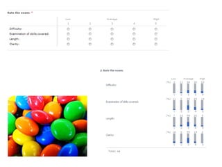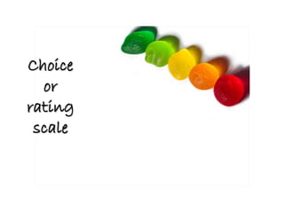 The document discusses different methods for collecting student feedback, including choice or rating scales, yes/no questions, and branching questions. It notes that rating scales and yes/no questions are common but questions whether they provide meaningful insights. The document also mentions including sample responses to help students understand what type of feedback is sought.