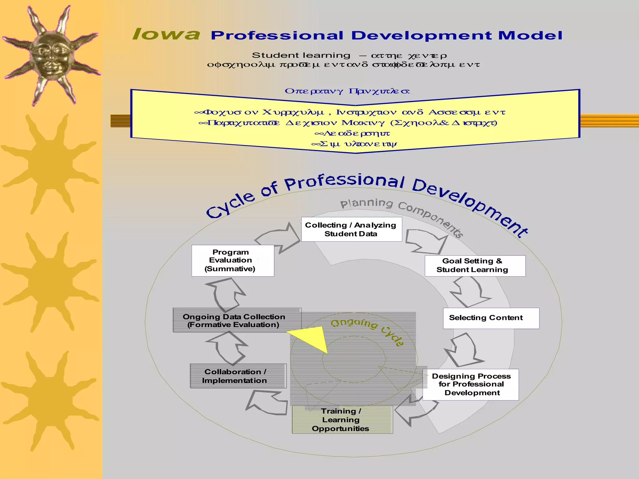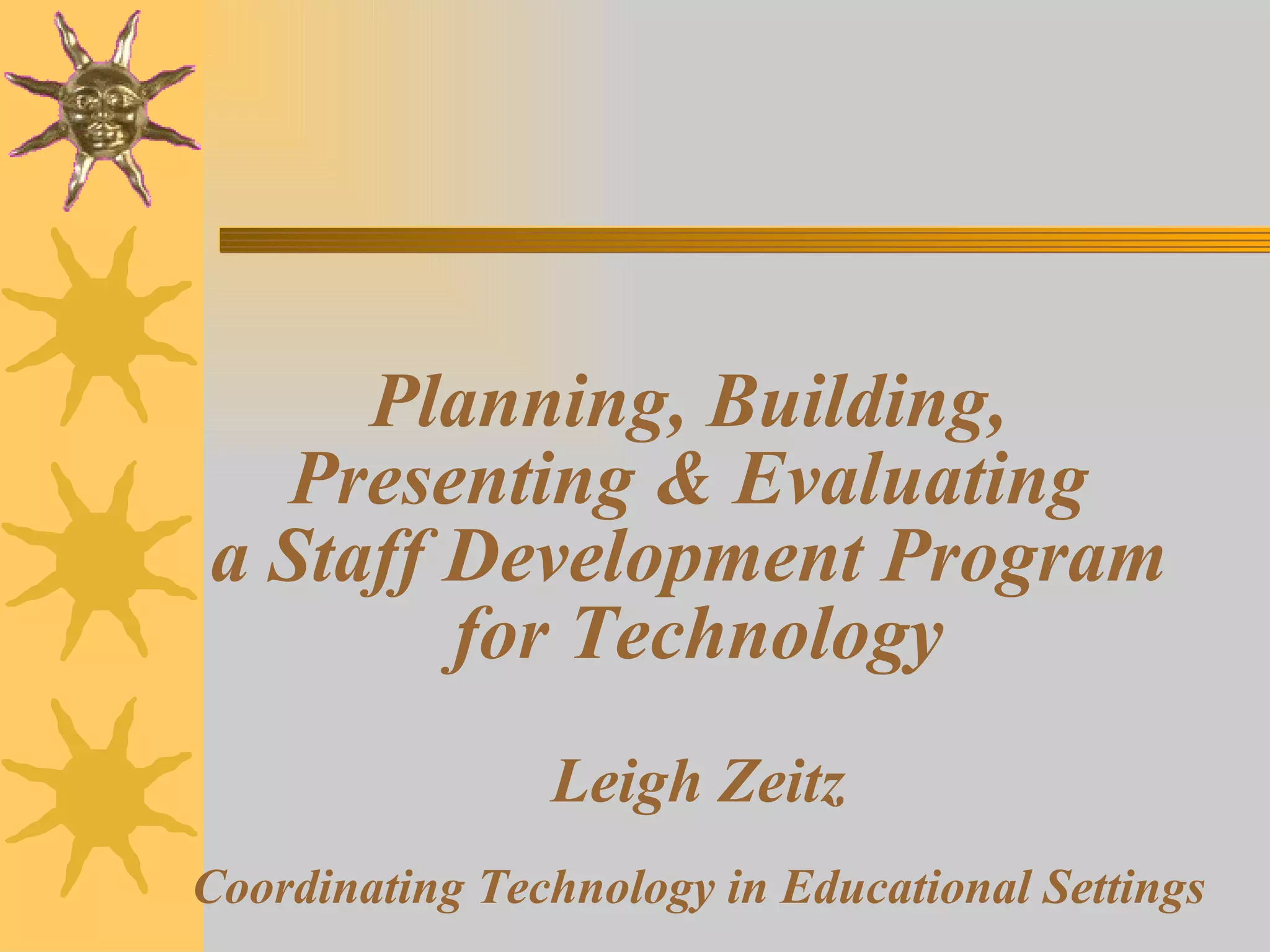 The document discusses the key elements of planning and implementing an effective staff development program for integrating technology. It outlines that a staff development plan should be based on assessing staff and student needs, include various activities like workshops, and use multiple formats like videos, modules, and online resources. It also emphasizes the importance of evaluating each workshop, the overall program, its effects on teaching skills and practices, and ultimately measuring improvements in student skills. The goal of staff development is to change teaching and learning, but this requires support, careful planning, and evaluation of outcomes.