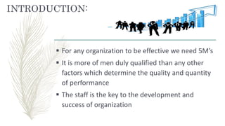 The document discusses staff development programs in healthcare organizations. It defines staff development as assisting individuals to attain new skills and knowledge through orientation, in-service education, and continuing education. Staff development is important to keep pace with advances in medical technology, improve patient care, and increase job satisfaction and organizational efficiency. The key aspects of an effective staff development program include assessing training needs, designing and implementing educational activities like induction training and in-service education, and evaluating the program's impact.
