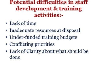 This seminar discusses staff development programs. It defines staff development and provides objectives, principles, models, methods and benefits of staff development programs. Some key points include: