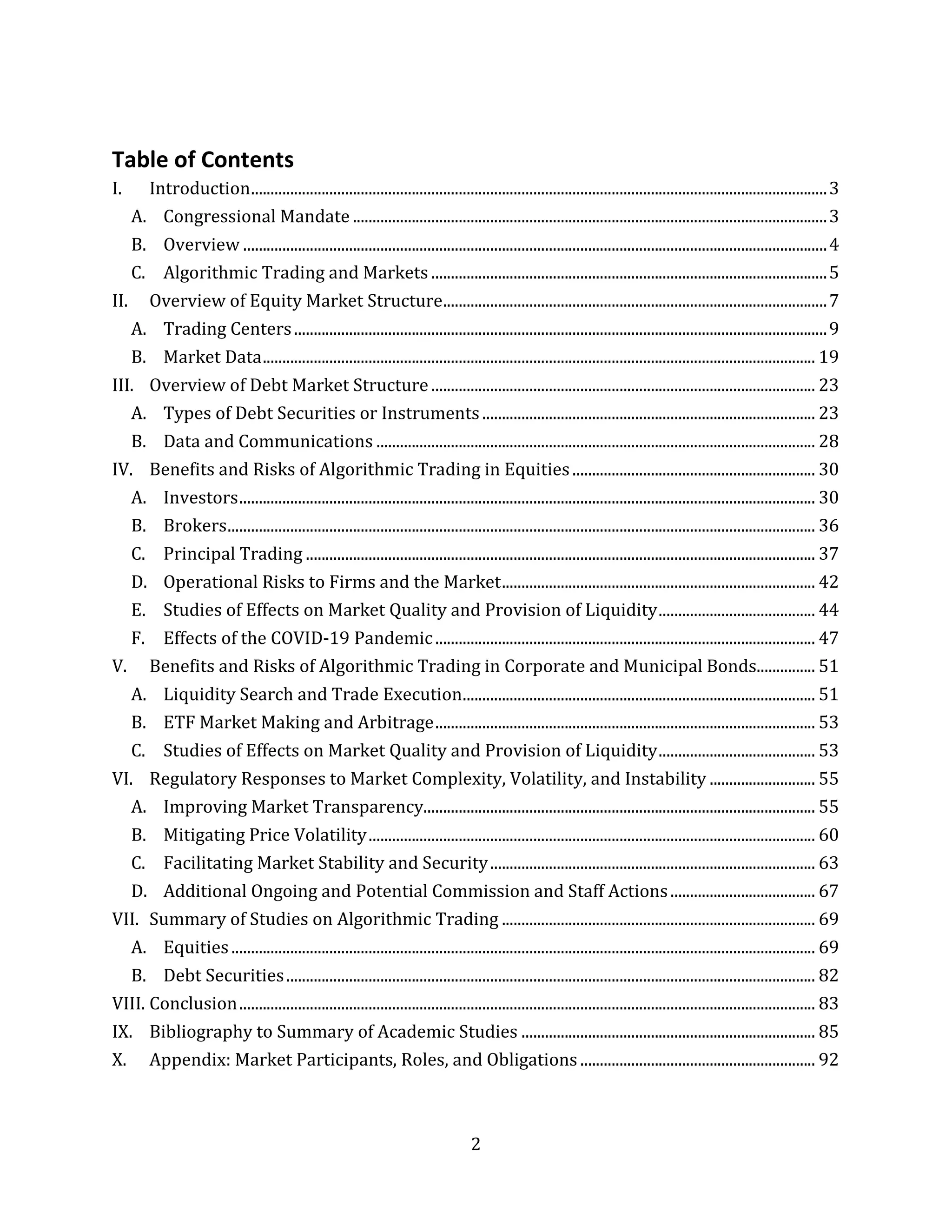 This report summarizes the benefits and risks of algorithmic trading in U.S. capital markets as required by Congress. It provides an overview of the structure of equity and debt markets and how algorithms are used in trading. The report finds that algorithmic trading has generally improved market quality and liquidity during normal periods, but may exacerbate volatility during stress. It also notes operational risks from increased complexity and interconnection of markets. The report makes no policy recommendations but provides information for regulators to consider.